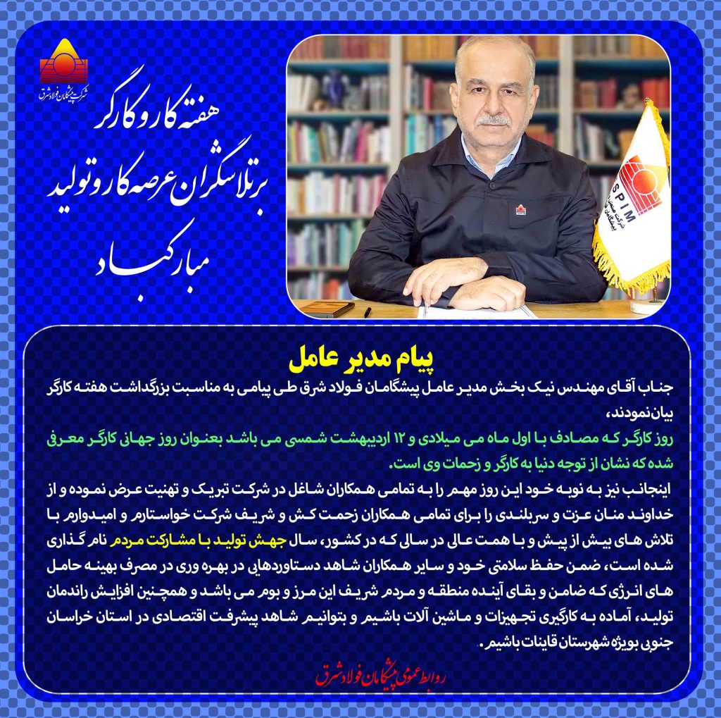 پیام مدیر عامل جناب آقای مهندس نیک بخش مدیر عامل پیشگامان فولاد شرق طی پیامی به مناسبت بزرگداشت هفته کارگر بیان نمودند، روز کارگر که مصادف با اول ماه می میلادی و ۱۲ اردیبهشت شمسی می باشد بعنوان روز جهانی کارگر معرفی شده که نشان از توجه دنیا به کارگر و زحمات وی است. اینجانب نیز به نوبه خود این روز مهم را به تمامی همکاران شاغل در شرکت تبریک و تهنیت عرض نموده و از خداوند منان عزت و سربلندی را برای تمامی همکاران زحمت کش و شریف شرکت خواستارم و امیدوارم با تلاش های بیش از پیش و با همت عالی در سالی که در کشور، سال جهش تولید با مشارکت مردم نام گذاری شده است، ضمن حفظ سلامتی خود و سایر همکاران شاهد دستاوردهایی در بهره وری در مصرف بهینه حامل های انرژی که ضامن و بقای آینده منطقه و مردم شریف این مرز و بوم می باشد و همچنین افزایش راندمان تولید، آماده به کارگیری تجهیزات و ماشین آلات باشیم و بتوانیم شاهد پیشرفت اقتصادی در استان خراسان جنوبی بویژه شهرستان قاینات باشیم.